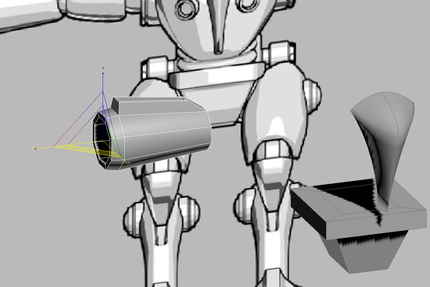 This is a glitch I kept running in to every time I would load my mech up to work on it. All of the pieces turn black and grey, and will disappear from view shortly after being selected. This could be a driver issue, or a 3ds Max issue. Either way, I was able to work around it by turning TurboSmooth on and off a few times until it stayed how it should.